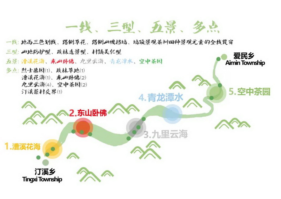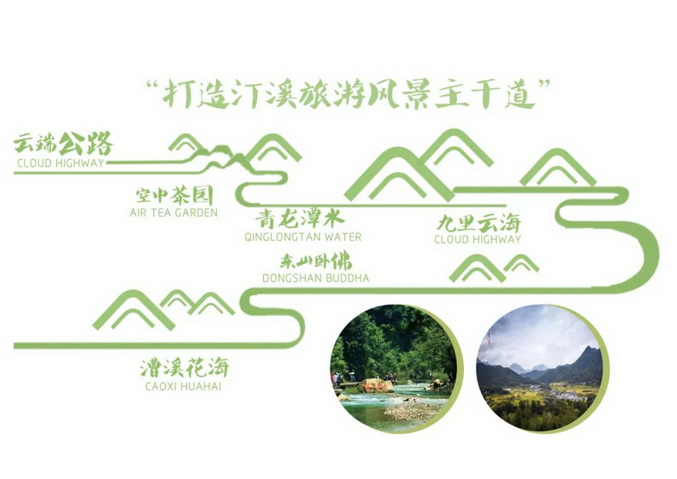 設(shè)計以“云端水墨”為主題,整合皖南川藏線的景觀資源,構(gòu)建“一線、三型、五景、十點”的景觀格局,致力打造“汀溪旅游風景攝影主干道”和“風景攝影式美麗公路”。