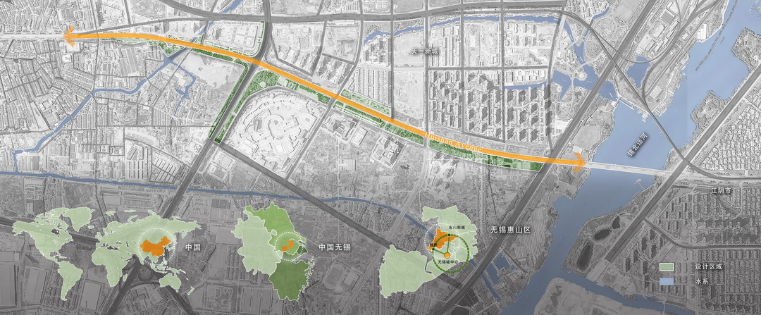 江蘇無錫市惠山大道鏈接無錫城區(qū)的南北門戶,是區(qū)域級綠道和城市主軸型景觀大道。在”中國雙碳戰(zhàn)略和無錫市惠山區(qū)建設(shè)北發(fā)展軸上的活力服務(wù)區(qū)的”雙重驅(qū)動下,為解決惠山區(qū)碳排放量大、項目所在的新城片區(qū)活力低,惠山大道綠廊效能單一等問題,本項目通過創(chuàng)新探索城市交通綠廊多效能融合設(shè)計模式,構(gòu)建高碳匯能力的綠色交通廊道,健全區(qū)域公共空間網(wǎng)絡(luò),IP引領(lǐng)“新尚惠山”景觀潮流和高活力的綠色低碳生活方式,成為激發(fā)周邊活力的觸媒,增進(jìn)惠山人民的福祉。