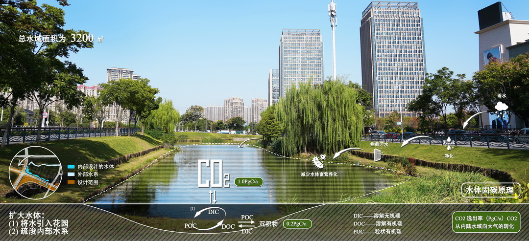 通過疏通場地內(nèi)原有水系,打造親生物雨水花園;通過配置多樣化的海綿設(shè)施,加強(qiáng)雨水截污,防止水體碳匯能力的減弱。