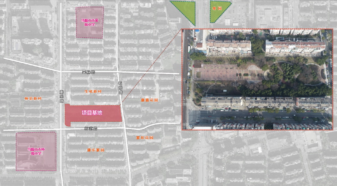 基地位于馬鞍山市康樂家園北側(cè),西起康樂路、東接石崗路,地塊東西長210m、南北寬60~80m,面積13700m2。比鄰多個住宅區(qū),臨近兩所重點小學。是滿足居民游憩社交、兒童游戲、運動健身、文化展示、科普教育要求的優(yōu)勢地塊。